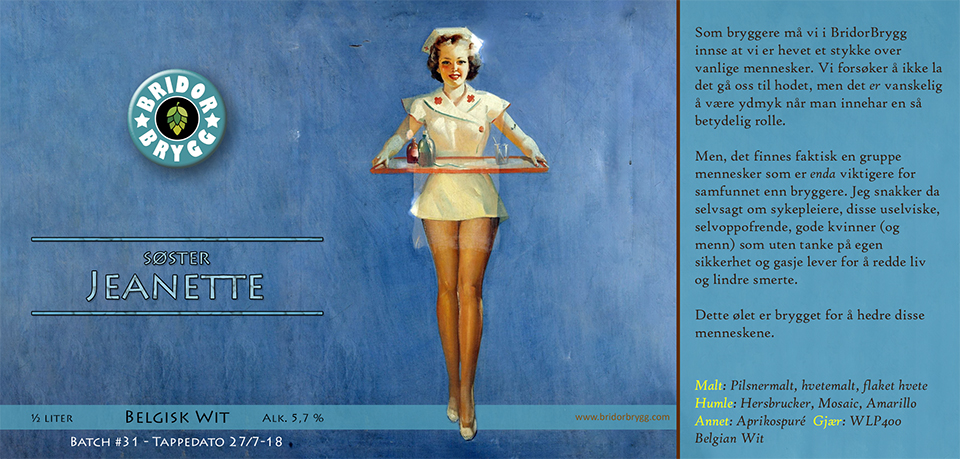 Dette ølet ble brygget på direkte forespørsel fra Jeanette, en venninne bosatt i Fredrikstad. Vi var der med bobil i sommer, og hun og jeg dro for å handle inn litt øl til en grillmiddag. Hun hadde egentlig tenkt å kjøpe Corona, men jeg anbefalte henne å prøve en Kronenbourg 1664 Blanc. Hun likte denne veldig godt, og spurte meg om det var noe jeg kunne få til. Siden jeg også liker 1664 Blanc godt fikk jeg lyst til å prøve.